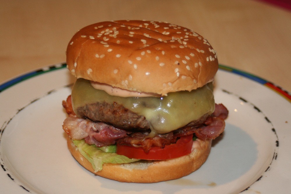 Die Burgerbrötchen werden halbiert und auf dem Toaster erwärmt. Diese werden dann mit der Burgersoße bestrichen. Die untere Hälfte wird mit dem Eisbergsalat, 2 Scheiben Tomaten und Bacon belegt.