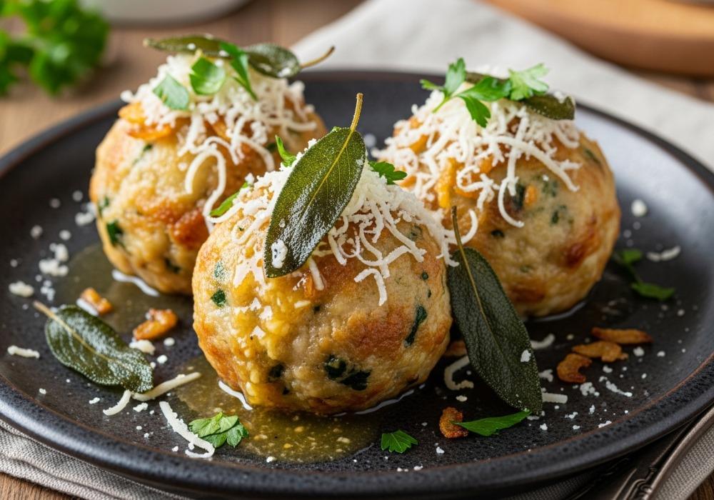 Bayrische Pilz-Spinat-Knödel mit Salbeibutter und Bergkäse