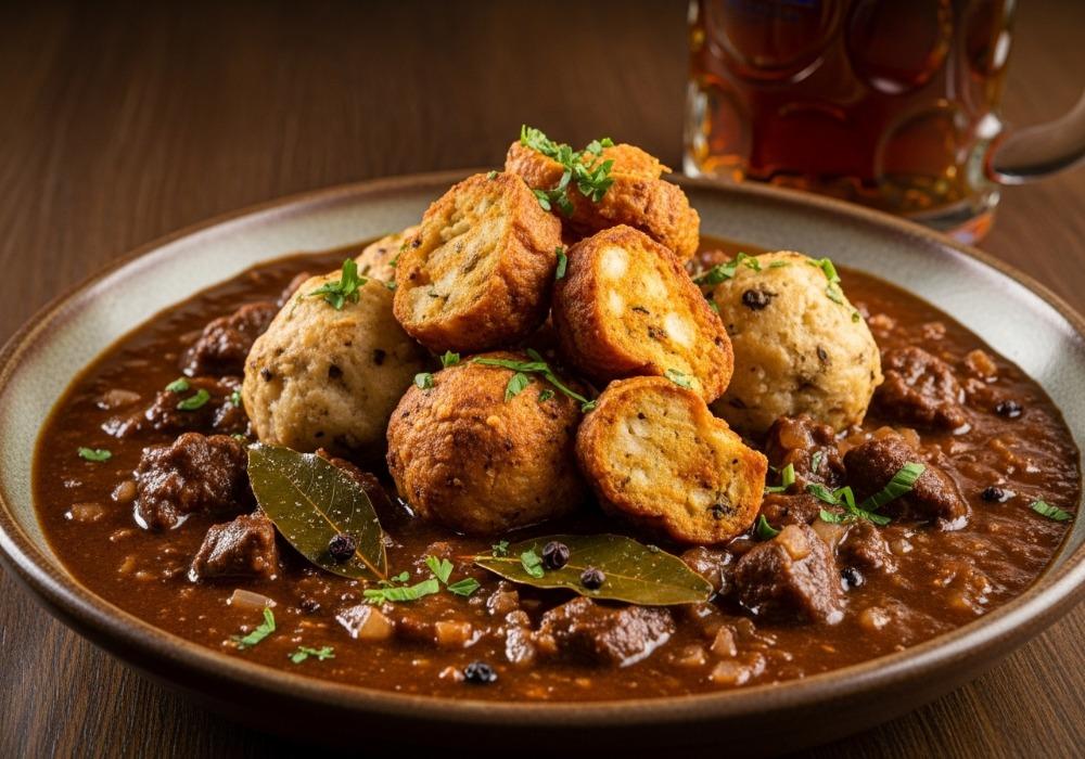 Bayrischer Biergulasch mit knusprigem Brezenknödel-Topping