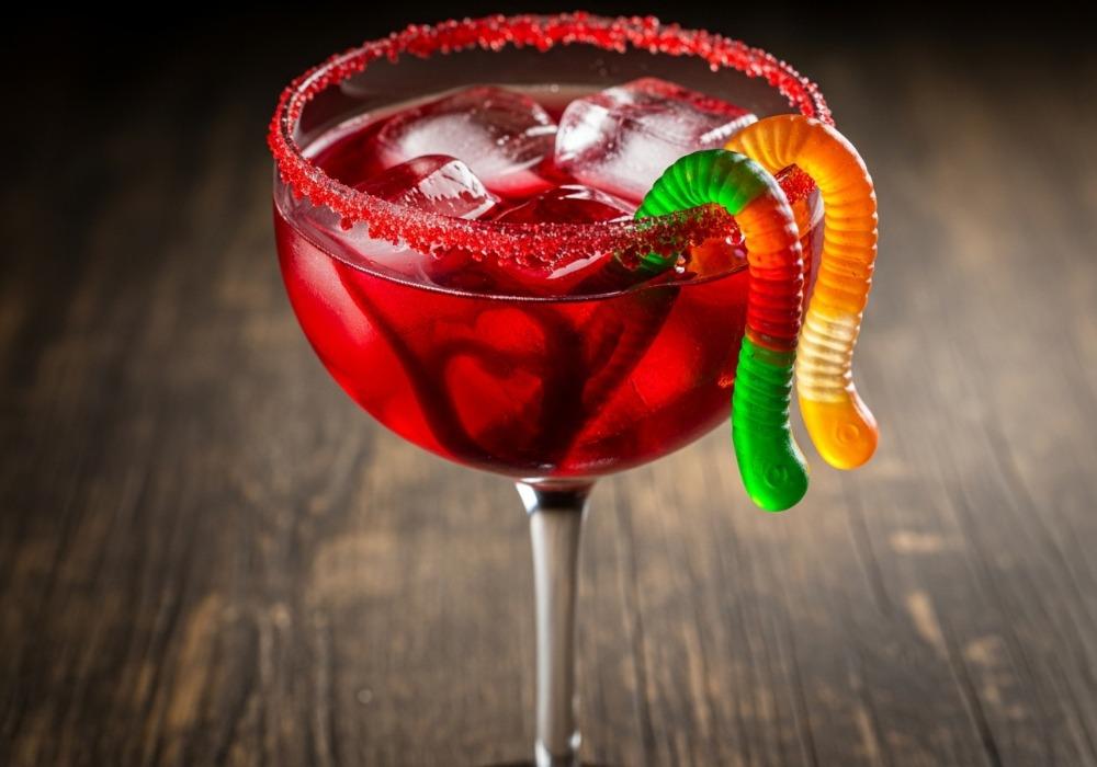 Hänge einen oder zwei Gummibärchen-Würmer über den Glasrand, damit sie aus dem Trank herausragen. Sofort servieren.