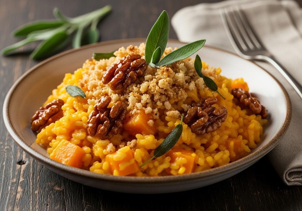 Cremiges Kürbisrisotto mit karamellisierten Walnüssen und Salbei-Crumble
