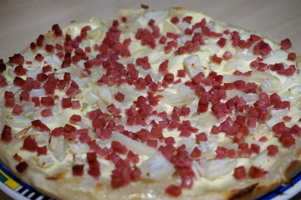 Nun wird der Teig sehr dünn ausgerollt und dann mit Creme fraîche bestrichen. Dann werden die Zwiebelscheiben und die Speckwürfel darauf verteilt.
