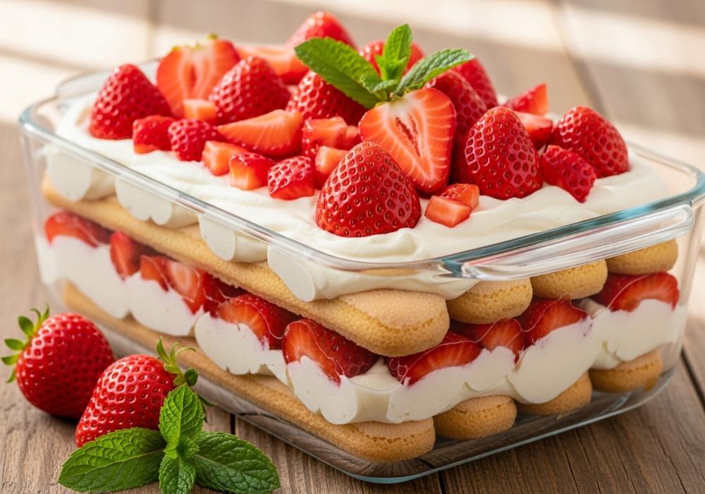 Vor dem Servieren die beiseitegelegten frischen Erdbeeren nach Belieben schneiden und das Tiramisu damit dekorieren. Optional mit frischen Minzblättern garnieren.