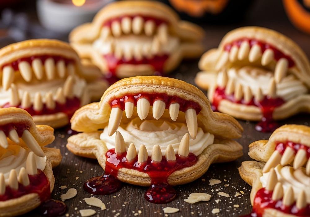 Träufle zum Schluss die erwärmte Himbeermarmelade vorsichtig über die „Zähne“ und die Ränder der Blätterteiggebisse, damit es aussieht, als würde Blut von den Reißzähnen tropfen.