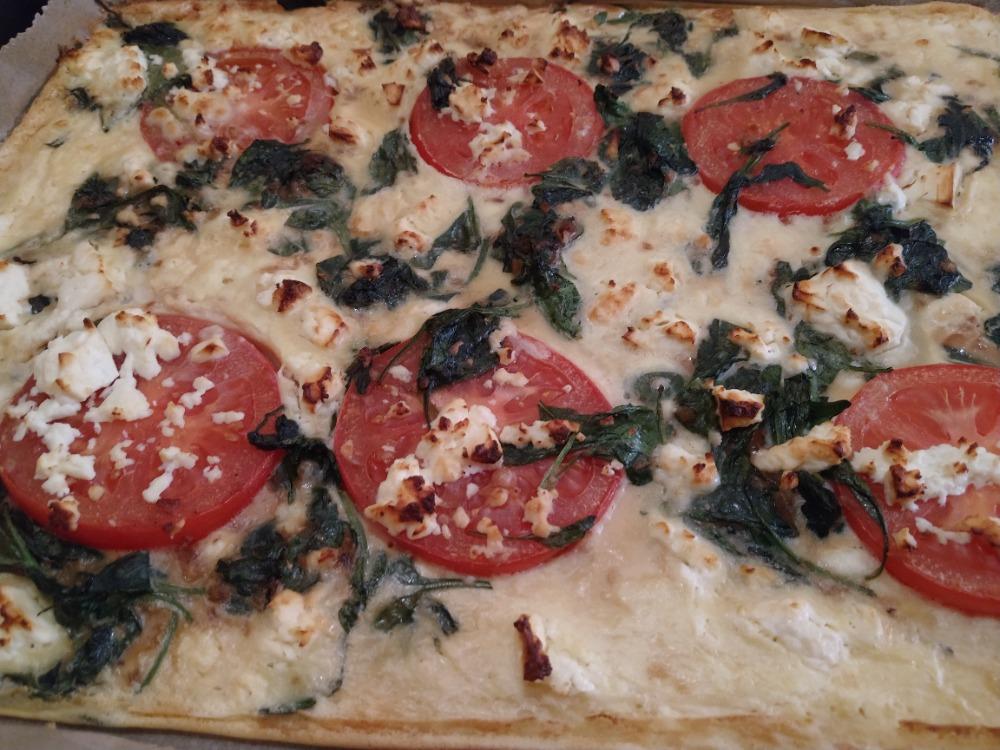 Nun den Teig auf ein mit Backpapier ausgelegtes Backblech füllen. Mit Tomaten und Spinat aus der Pfanne belegen. Schließlich noch den Hirtenkäse darüberbröseln.