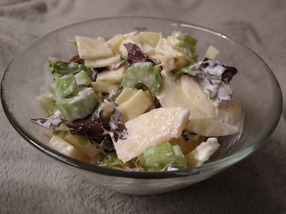 Die geschälten und entkernten Äpfel in Scheiben schneiden und mit Zitronensaft beträufeln. Ananasstücke und Kirschen abtropfen lassen. Käse in Würfel und Staudensellerie in Scheiben schneiden.