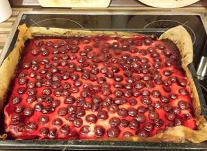 Nun werden die Kirschen auf der Pudding-Schmand Masse verteilt. Den Kirschsaft bitte für später aufbewahren und nicht dazu geben.