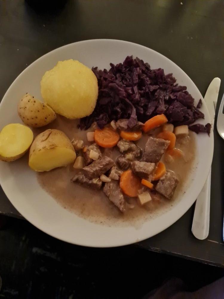 In einem großen Topf die Zwiebel mit Butterschmalz anschwitzen, dann das Fleisch hinzufügen und mit der Flüssigkeit und dem Suppengrün auffüllen. Einen guten Schuss Rotwein und etwas Essig erneut hinzufügen. Einmal gut aufkochen und dann anderthalb Stunden bei leichter Hitze schmoren lassen.