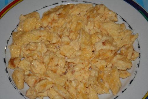 Butter wird in der Pfanne zum Schmelzen gebracht. Dann wird das Ei-Milch-Gemisch in die Pfanne gegeben und bei mittlerer Hitze zum Stocken gebracht. Wichtig ist, dass das Rührei durch ständiges Rühren mit den Pfannenwender mit braun wird.