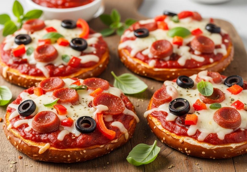 Jede Brezelhälfte großzügig mit der gewürzten Tomatensauce bestreichen. Anschließend den geriebenen Mozzarella gleichmäßig darauf verteilen. Die Mini-Salami oder Schinkenwürfel, Paprikawürfel und optional die Oliven sowie Champignons darauflegen.