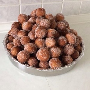 Wenn die Bällchen braun (dunkel braun, siehe Bild) sind, dann diese kurz abtropfen lassen und dann direkt im Zucker-Zimt-Gemisch wälzen.