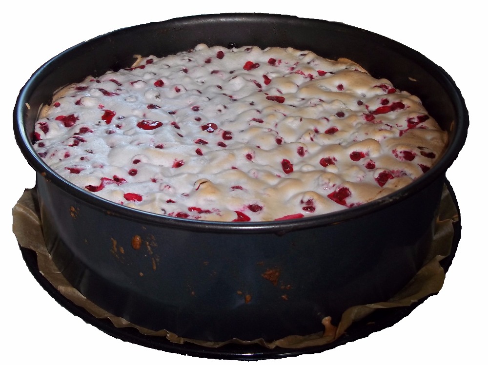 Als nächster Schritt wird das Eiweiß zu einem steifen Schnee geschlagen. Dann wird der verbliebene Zucker, sowie die Speisestärke hinzugefügt. Die Masse wird etwa 5 Minuten weitergeschlagen. Anschließend werden die Johannisbeeren unter die Eiweißmasse gehoben und auf den Kuchenboden gegeben. Der Kuchen backt dann bei 200 °C noch 15-20 Minuten weiter, bis er hellgelb ist. Fertig ist der Kuchen.