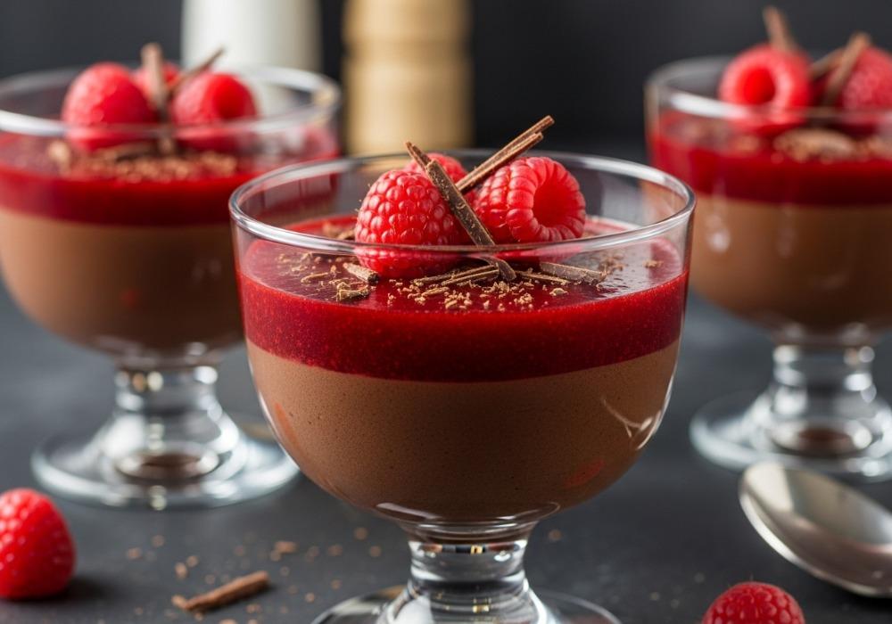 Sobald die Schokoladenmousse fest genug ist und das Himbeermark leicht abgekühlt, aber noch flüssig ist, das Himbeermark vorsichtig auf die Schokoladenmousse in den Gläsern schichten. Die Desserts für mindestens weitere 2 Stunden oder besser über Nacht in den Kühlschrank stellen, damit auch die obere Schicht fest wird. Vor dem Servieren optional mit frischen Himbeeren oder Schokoladenraspeln garnieren.