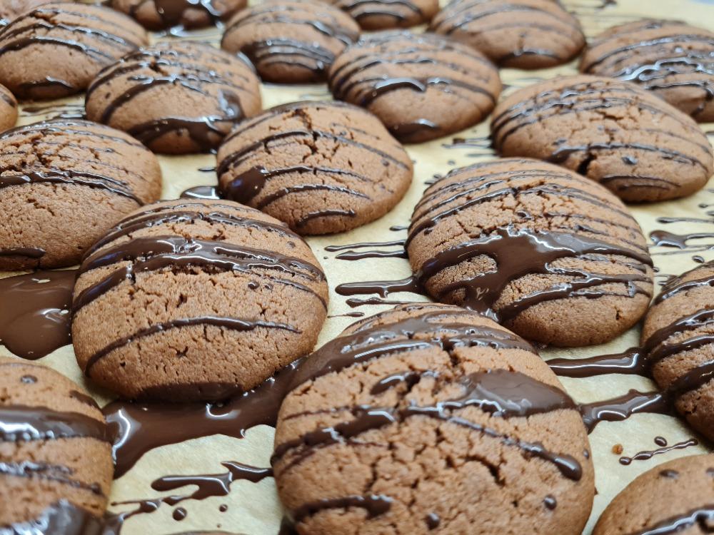 Die Plätzchen im Anschluss auskühlen lassen und mit geschmolzener Zartbitterkuvertüre verzieren.