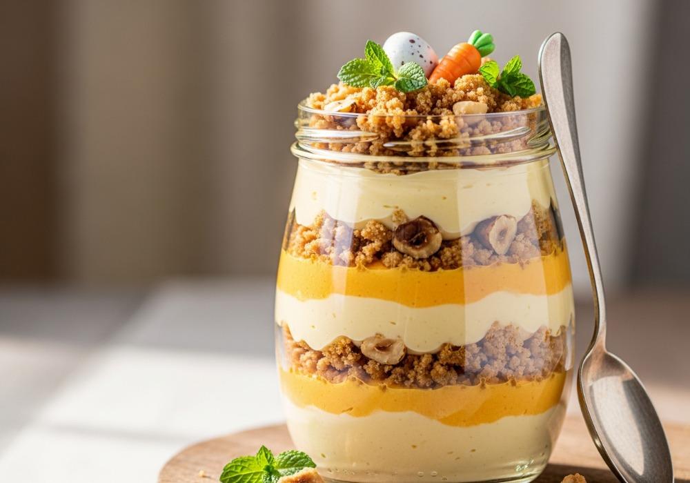 Oster-Möhrenkuchen-Mousse mit Orangen-Joghurt und Haselnuss-Crumble
