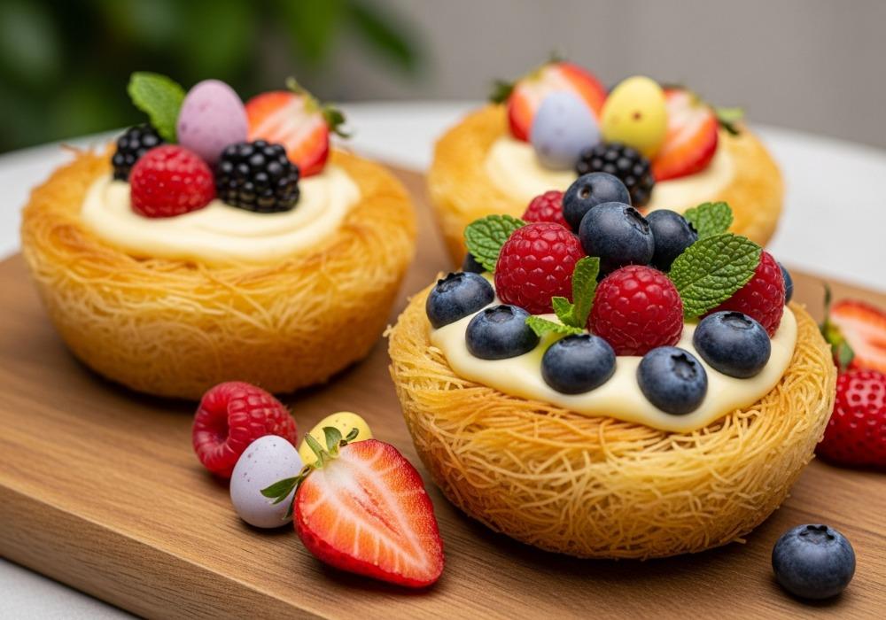 Vor dem Servieren die Oster-Nester auf Dessertteller anrichten. Die fest gewordene Eierlikör-Mousse mit einem Löffel oder Spritzbeutel in die Mitte der Nester füllen. Die frischen Beeren um die Mousse herum oder darauf verteilen. Mit frischer Minze und optional kleinen Schokoladeneiern garnieren.