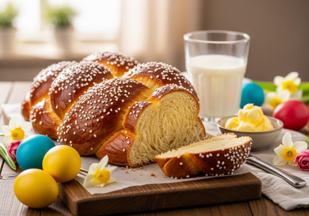 Den fertigen Osterzopf aus dem Ofen nehmen und auf einem Kuchengitter vollständig auskühlen lassen, bevor er angeschnitten wird.