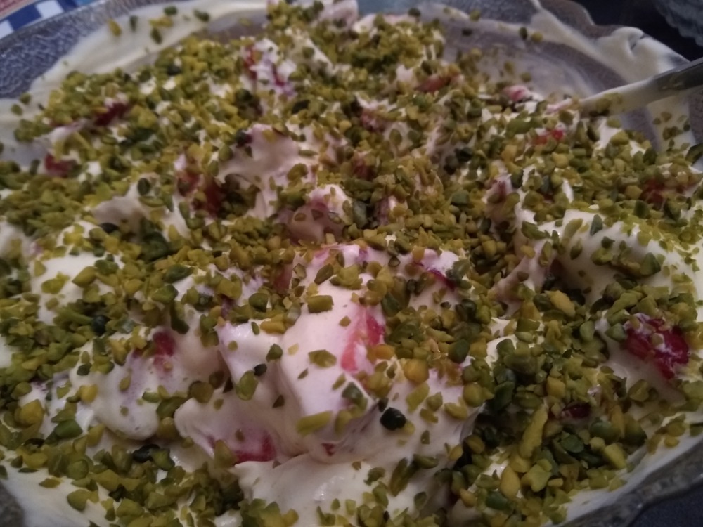 Paradies Creme in einer Schüssel mit den Erdbeeren vermengen, Pistazien darüber streuen. Fertig
