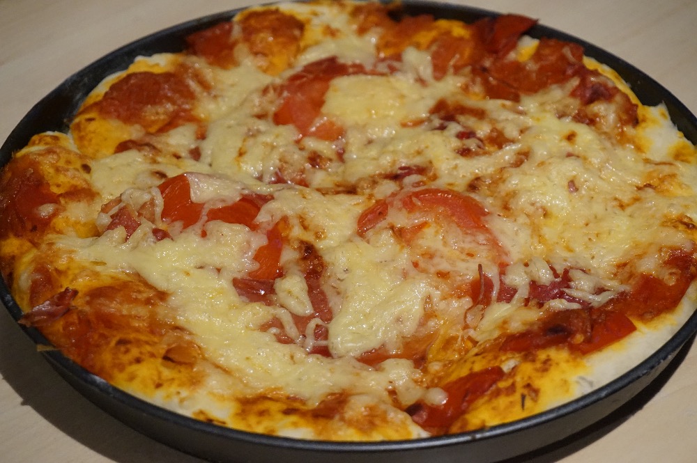 Der Hefeteig wird dünn auf ein Blech oder Pizzaform ausgerollt. Nun kommt die Tomatensoße auf die Pizza. Anschließend kommen die Tomatenscheiben, der Schinken und der Käse oben drauf und die Pizza wird zum Backen für etwa 10 - 15 Minuten bei 180 °C Umluft in den Backofen gegeben.