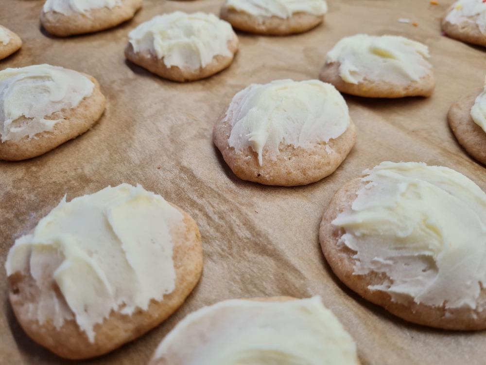 Nachdem die Plätzchen ausgekühlt sind, können sie mit der Glasur bestrichen werden.