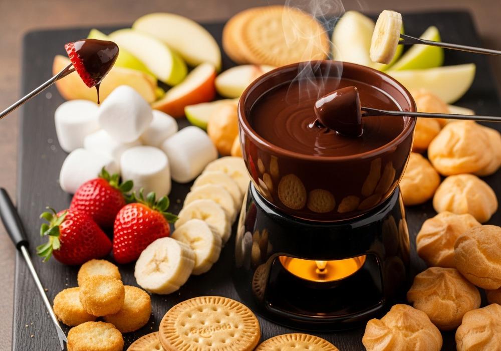 - Zum Dippen: Frische Erdbeeren, Bananenstücke, Apfelspalten, Marshmallows, Butterkekse, Profiteroles