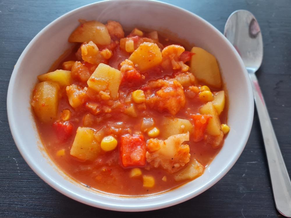 Kartoffeln schälen und in mundgerechte Stücke schneiden. Paprika und Blumenkohl waschen und klein schneiden. Mais abgießen.