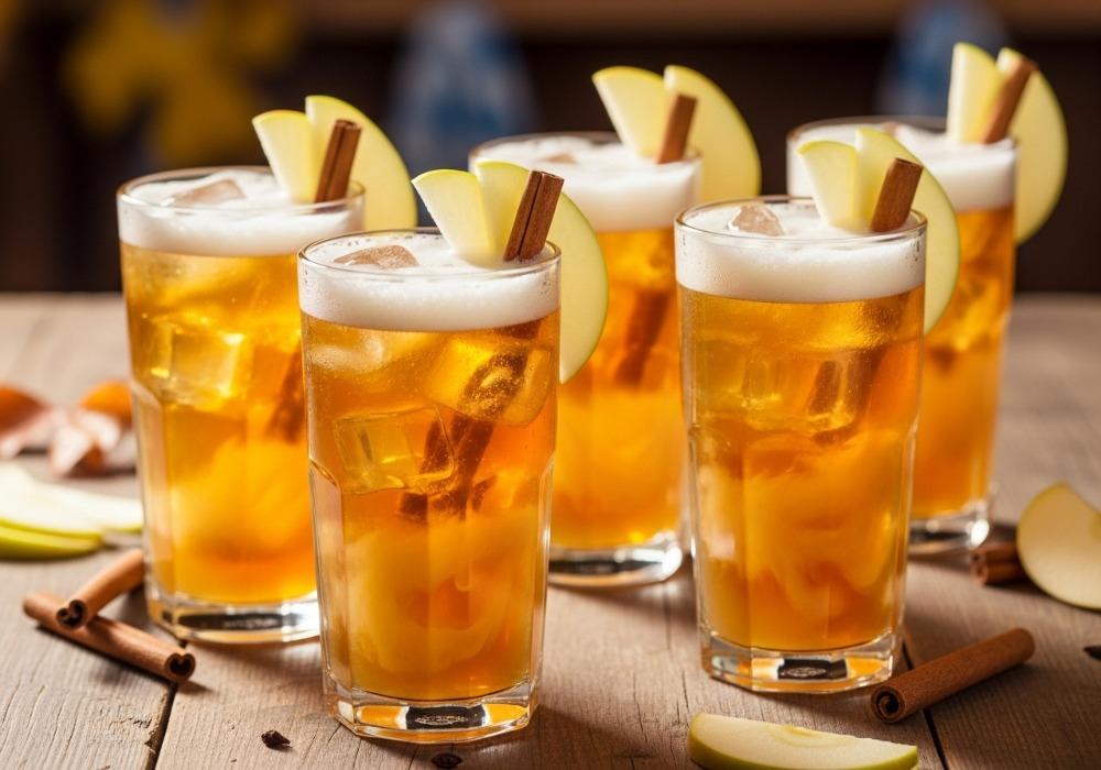 Den naturtrüben Apfelsaft, den Zimtsirup und den frischen Zitronensaft gleichmäßig auf die Gläser verteilen.