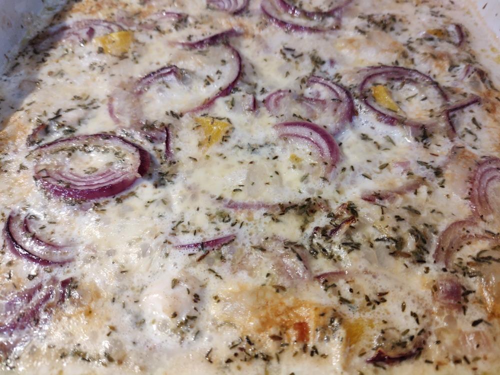 In eine Auflaufform Hähnchenbrustfiletstücke, Paprika und Zwiebeln geben, dann die Soße darüber gießen.